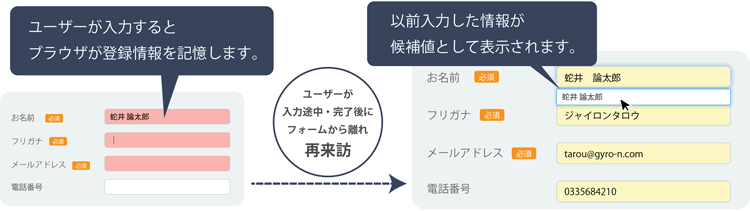 フォームの入力情報をブラウザに記憶させる「再入力アシスト」を利用すると、ユーザーが情報(例:氏名、メールアドレス、電話番号、住所など)を入力する際に、ブラウザ上のローカルストレージに入力情報を記憶しておきます。