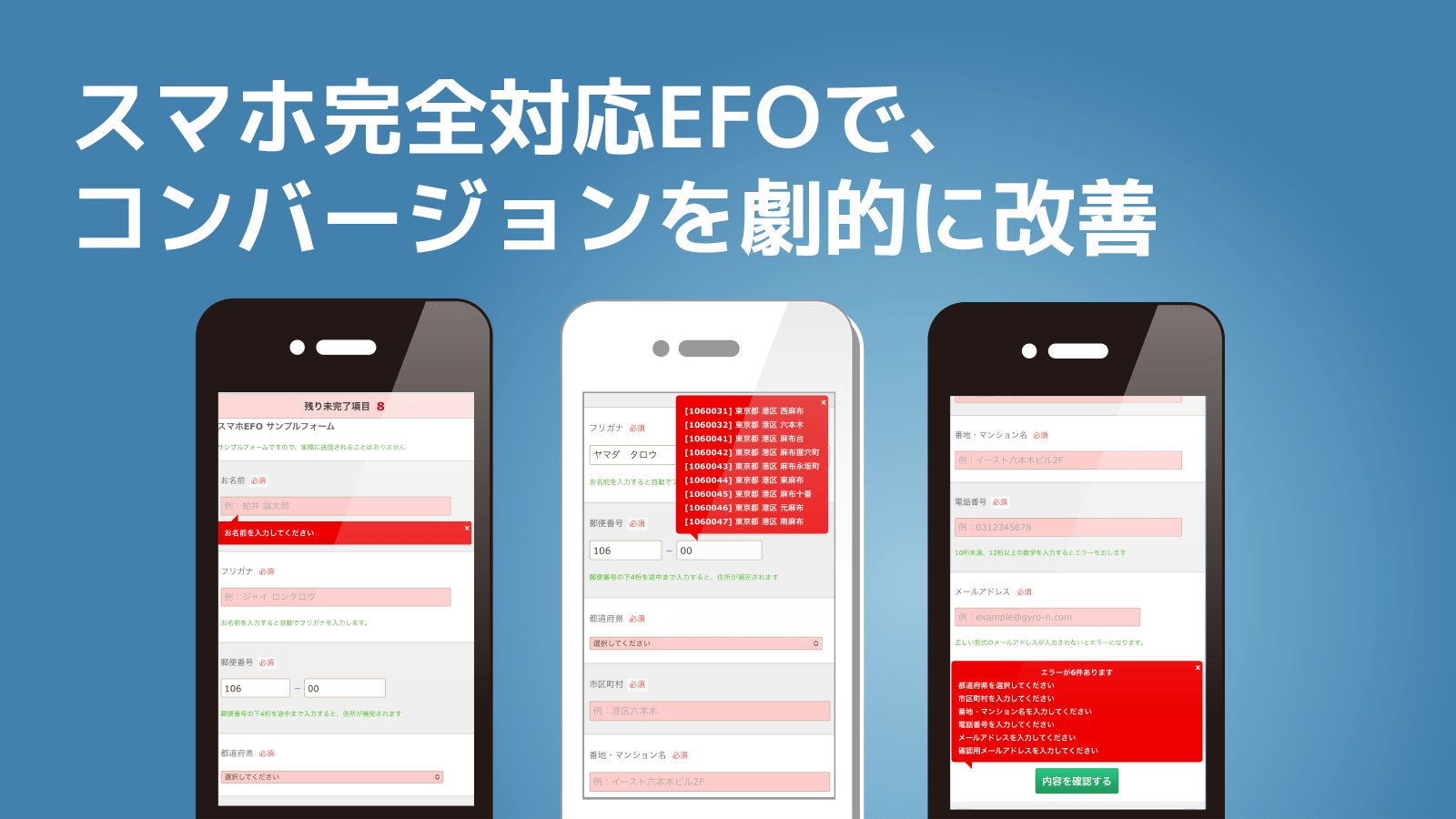 つまり、「何も考えなくてもミスなく入力できるフォーム」を実現し、コンバージョン率の劇的な改善が期待できます。